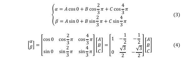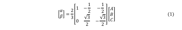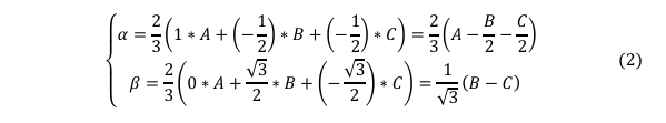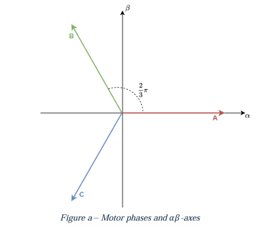 The first step in FOC is applying Clarke transformation, which converts the motor’s three phase (A, B, C) into a two-phase (𝛼,𝛽).
