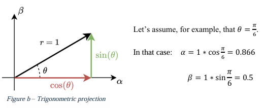 The shift from sin(𝜃) to cos(𝜃) in 𝛽-axis occurs because 𝛼-axis and 𝛽-axis are orthogonal.