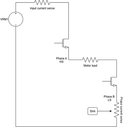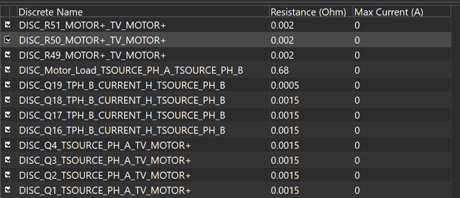 Defined the discretes: connected the current loop through sense resistors → high-side transistors → motor load → low-side transistors. For the motor, I used a simple two-terminal resistor model adjusted to match the simulated current.